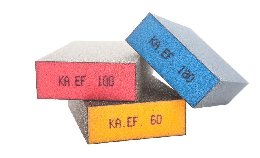 Dank der 4seitigen direkten Beschichtung des mittelfesten druckverteilenden Schaumstoffes sind die KA.EF. Schwämme 100 ideal für die universale Bearbeitung von Fälzen, Kanten, Flächen und Radien. Sehr gute Schleifergebnisse werden ebenfalls erzielt beim Fein- + Zwischenschliff von Lackierfehlern, Lackläufern, Schmutzeinschlüssen, Orangenhaut, Staubeinschlüssen… im Trocken- und Nassschliff.Durch den Einsatz von Schaumstoff als Trägermaterial unterscheiden sich gestreutes Korn und daserzielte Schliffbild. Wir geben daher an: Korn = gestreutes Korn und Schliffbild = entspricht ca. demErgebnis von Schleifpapier (z.B. Korn 100 = ca. P 220). Bitte prüfen Sie selbst. Ein, wenn auchgeringer, Kornausbruch ist normal. Werkstücke sind nach der Bearbeitung zu reinigen.
